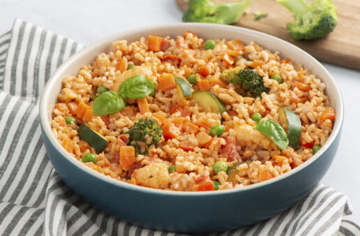 A perfect side or vegetarian main, this Rice Primavera is made with Success® Brown Rice, fresh veggies, Italian seasonings, heavy cream and stewed tomatoes.