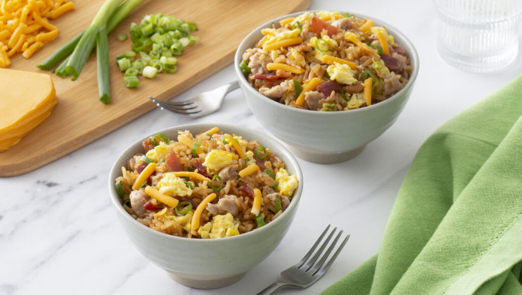 What’s quicker than making this 20-minute complete breakfast dish? Reheating it from frozen, when every minute counts! Loaded with sausage, bacon, eggs and fragrant jasmine rice, this take on traditional fried rice is a warm, filling and welcome break from the usual bowl of cold cereal.